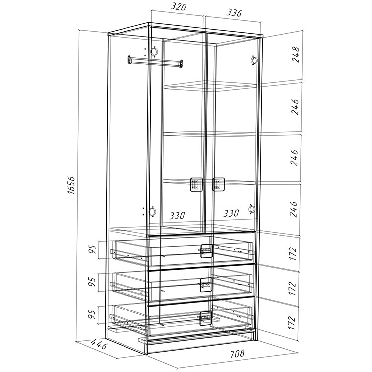 Шкаф является двустворчатым, внутри две зоны с четырьмя полками и со штангой для «плечиков».